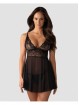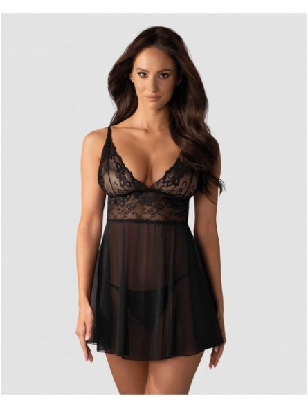 Élégant ensemble qui va réveiller vos sens! Bretelles ajustables. Séduisante dentelle sexy couvrant légèrement la poitrine et le dos qui enflammera les sens de votre partenaire. La partie inférieure est évasée et couvre les imperfections du corps. La maille fine et transparente encouragera des ébats endiablés. Les bretelles réglables et confortables vous permettront d'être à l'aise. String dentelle assorti inclus.
